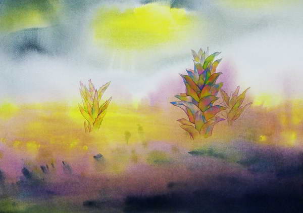 其中《自然物語(yǔ)》系列作品非常吸引我,作品的空間似乎是遙不可及的外太空浩瀚的宇宙,濃重的色彩,宣染著色的方法產(chǎn)生一種隨意大氣、簡(jiǎn)約不凡的視覺(jué)效果;精致的筆觸刻畫(huà)出細(xì)膩的植物,營(yíng)造出真實(shí)的幻境。