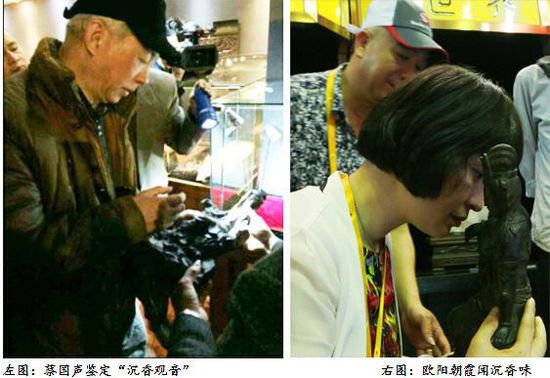 隨著講解的深入,圍觀的人群越來越多,尊寶世界明清古件收藏家呂新介紹道:沉香木本來就很貴,特別的是“奇楠成香”又是達到收藏級的,此尊“沉香觀音”貴在三點:一是這個有文化價值,在全世界是罕見的,大體積明朝沉香觀音;第二,這個觀音開臉顯得惟妙惟肖,外觀端莊祥和,且衣服雕刻具有飄逸動感,蔡國聲曾評價其“價值連城”;第三,冠木上面有釋迦牟尼佛像,品類屬極其稀少,是可遇不可求的鎮館之寶。全國頂級鑒寶專家歐陽朝霞在湖南礦博會展會現場,也充分肯定了這尊沉香木觀音的文物價值。