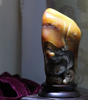 另一件作品《后得?!罚潜本W運會之前,時任中國女排主教練的陳忠和請蘇然做的佳品。此玉是新疆和田玉籽料,漿石由金黃向褐色延伸,與玉石相間而生,玉質色白處細膩油潤,皮料灑金。正當蘇然把此玉放在眼前把玩揣摩時,幾只鳥突然從窗前飛過,而此玉的倒置狀正如丹鳳抬頭。鳳為百鳥之首,暗合了陳忠和女排主教練的身份。靈感讓她若有神助,從容雕琢:鳳凰的頭部是一片濃郁的金黃,鳳啄鳳冠呈金黃色,而鳳凰眼睛部分呈現黑色;另一只鳳目烏亮,兩兩對稱。蘇然一氣呵成完成了作品,既充分彰顯出玉石的天然魅力,又與造型渾然天成。蘇然為它起名為《后得福》,諧音厚德福,希望此玉的福氣能夠祝福陳忠和帶領中國女排獲得榮譽。