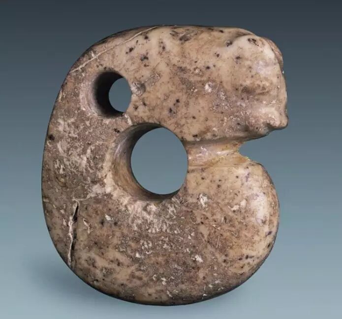 曲體玉龍也叫“玦”形龍,是紅山文化龍形玉雕中最多的一種,形體和頭部有大有小,缺口處有的斷開,有的未斷開,時代有早有晚,出土時多位于墓主胸部。墓主生前應是有地位和權力的部落首領或巫師,玉龍是巫覡以玉事神時所用的玉神器。這件玉龍比紅山的玉豬龍在造型上更為原始。有考古工作者從地層堆積推測,其年代可能早于遼寧紅山文化。