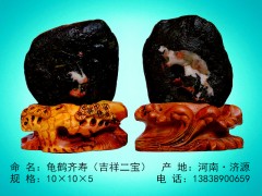 賞析:天賦神韻,石生二寶。這是一塊奇石兩面圖像:一面是神龜,雄渾強健,闊步向前,體現了龜柔中有剛、能屈能伸的智慧和力量;另一面是仙鶴,昂首挺胸,引吭高歌,突顯了“鶴鳴于九皋,聲聞于天”的豪邁氣概,二者神韻充盈,氣度非凡。色調黑如瑪瑙明如銀、白如玉,晶瑩剔透,黑白分明,凝重高雅。龜鶴都是有靈性的神獸仙禽,同時出現在一塊石頭上,可謂石中神品,天然瑰寶,龜齡鶴壽,祥潤至極! 龜是瑞獸,又名神龜、靈龜、寶龜、文龜,象征著健康、長壽、吉祥、平安、智慧、堅強、仁厚。龜是水陸兩棲動物,活動空間大,閱歷長。龜又和貴的發音差不多,所以龜不僅象征“壽”,還代表“貴”。龜是古代的四靈(龍、鳳、麟、龜)之一,而且“四靈”中只有龜在自然界是客觀存在的。因此,龜在我國被視為吉祥之物而奉為神靈,古人認為龜是人與天神之間聯系的中介,通過它可以領會神的意志,尊崇龜可以獲得神的保佑,安家鎮宅。《龜經》載:“龜一千二百歲,可卜天地終結。”龜甲是古人占卜的用具,觀其裂紋而知吉兇,使人對龜產生一種神秘、敬畏之感。據歷史記載:河圖負于龍馬,洛書呈于元龜,以其所出現地在河洛,故名“河圖”、“洛書”。《周易》系辭中說:“河出圖,洛出書,圣人則之”,《漢書•五行志》記:“伏羲氏繼天而王,受河圖則而畫之,八卦是也;禹治洪水,賜洛書而陳之,洪范是也。”《洛陽記》載:“禹時有神龜出于洛水,負文列于背以授禹,文即治水文也。”大禹時,洛陽西洛寧縣洛河中浮出神龜,背馱“洛書”(其甲殼上圖象結構是:戴九履一,左三右七,二四為肩,六八為足,以五居中,五方白圈皆陽數,四隅黑點為陰數。)獻給大禹。大禹依此治水成功,又依此劃天下為九州,定九章大法治理社會。自古就有“洛書者,數之源也”的說法,從星象學上看,天空九宮星象其數目方位都與洛書完全一致。術數中常說的“九宮”就是神奇的洛書之數,奇門遁甲術也采用此九宮作為基石。 河圖,明天地之生成; 洛書,明萬物之變化。河圖之象,不易而易,如天地之道;洛書之象,易而不易,如天地之德。 鶴屬仙禽,又名仙鶴、白鶴,象征長壽、幸福、吉祥、忠貞、圣潔、高雅、成仙。明代朝服用丹頂鶴補子為文官最高象征。《詩經·小雅·鶴鳴》 “鶴鳴于九皋,聲聞于天。”“夫鶴名,吉祥物也。”《瑯環記》:“鶴,仙禽也,于物為多壽,感于陽,故鳴于子,雄則聲聞數里”, 明朝《香囊記·慶壽》:“祈壽考,愿鶴算綿綿,福海滔滔”,《抱樸子·對俗》:“知龜鶴之遐壽,故效其道引以增年”,《素問·靈蘭秘典論》:“故主明則下安,以此養身則壽”,《淮南子說林訓》:“鶴壽千歲,以極其游”,漢儒《相鶴經》:“羽族之宗長,仙人之麒驥”,《墨經》言:“蛤蟆日夜鳴,口乾而不聽之。鶴雖時夜而鳴,天下振動,誠謂多言無益,惟實干能興邦”,鶴又是奮進之化身。民俗畫畫著眾仙拱手仰視壽星駕鶴的圖案,謂之“群仙獻壽”圖;鶴傲立巖石的圖案,名曰“一品當朝”;鶴向著日頭高飛的圖案意思是高升。當成年鶴長鳴時,小鶴也鳴叫,因而成為父唱子和的象征。鶴性情雅致,形態美麗,被稱為“一品鳥”,在中國傳統文化中它跟仙、道、人的精神品格有著密切的關系,也是道教神仙人物的座驥。鶴雌雄相隨,步行規矩,情篤而不淫,具有很高的德性,故古人多用翩翩然有君子之風的白鶴,比喻具有高尚品德的賢達之士,把修身潔行而有時譽的人稱為“鶴鳴之士。”· 郭璞《游仙詩》:“借問蜉蝣輩,寧知龜鶴年!” 宋·侯寘《水調歌頭·為鄭子禮提刑壽》“坐享龜齡鶴,穩佩金魚玉帶,常近赭黃袍。”《水滸傳》描寫張真人所住的上清宮時寫道:“階砌下流水潺湲,墻院后好山環繞,鶴生丹頂,龜長綠毛”。若鶴生丹頂,龜長綠毛則更是神中之神了,只有得道的異人所住的圣地才會有。 古往今來,龜鶴都是公認的壽仙,長壽的象征。我國民間歷來流傳著“龜齡鶴壽”、“龜鶴齊齡”、“龜鶴齊壽” “龜鶴同壽”“龜鶴延年” “鶴壽無量”“鶴壽松齡” “鶴發童顏“駕鶴翔云”“松鶴長春” “鶴壽”、“鶴齡”、“鶴算的稱呼和成語故事,世人常以此作為祝壽之詞,表述吉祥與祝福。古代還鑄造有“龜鶴齊壽”的花錢銅幣,人們常將龜鶴制作為風水吉祥物品,擺放在特定的位置,會具有強大的磁場力量或作用,龜鶴能飽吸天地山川之靈氣,改善室內的不良氣場,祈吉納福鎮宅避邪,帶來祥瑞之氣,使人身心健康增福增壽!”” 此石源于《女媧補天》神話傳說的發祥地,是媧皇補天時遺棄的五采石。女媧補天。傳說上古的時候,水神共工和火神祝融,為了爭當領袖大戰,山被撞倒天就塌下來一塊,成了一個大窟窿。天河里的水就順著窟窿傾瀉而下,一場災難陡然降臨人間。造人之神女媧,為拯救人類,在王屋山天壇山周邊,采集了紅黃藍白黑五種顏色的石子,燒熔成五色巖漿,灌進漏洞,補好了天的窟窿,所剩彩石散落在王屋山中。清代大文豪、豫晉陜三省鹽務劉大觀游天壇、王屋留下了諸多詩篇,有《澗石》贊曰:“石在山溪分五色,孕毓青黃赤白黑。媧皇補天斥棄余,至今流落群仙國。細者如卵鉅如甕,赤者如硃黑如墨。時從澗底鋪瓊瑤,翡翠凝膏蠟凝汁。吁嗟造化真小兒,費此無窮點染力。高人賞識貴人購,夜吐光芒照琴瑟。”這些彩石一石多色,絢麗多彩,相映成趣,韻味無窮,遠古的神話傳說和這絢麗的色彩更增添了彩石的神秘