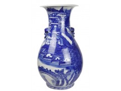 法口,大頸,獅紐輔首,青花樓臺亭閣,典型仿康熙外銷品,青花料呈洋蘭色,晚清民國制品
